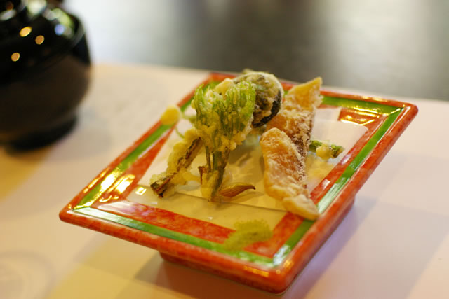 鯉の竜田揚げと季節の野菜を抹茶塩でいただきます。