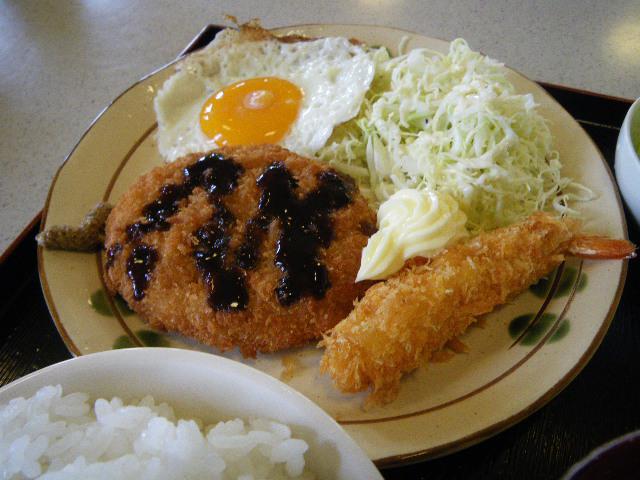 ▼メンチカツ&エビフライ&目玉焼き&塩キャベツ