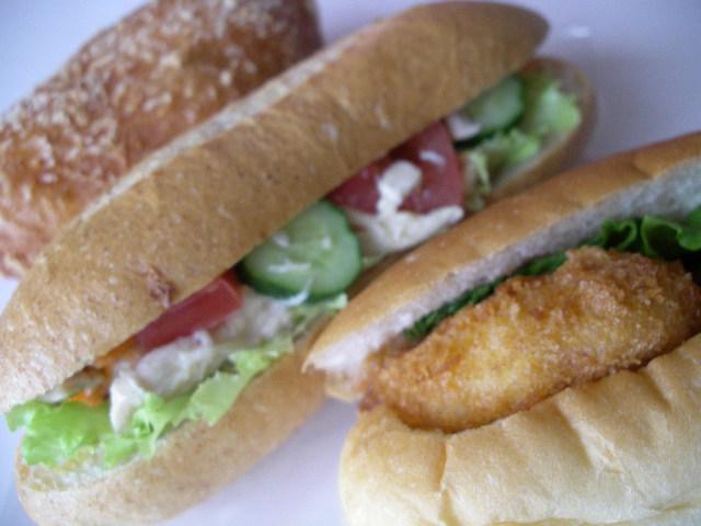 真ん中のパンはハード系のトマトとチキンドッグ。手前は、ポテトコロッケドッグ。どちらもオススメ。