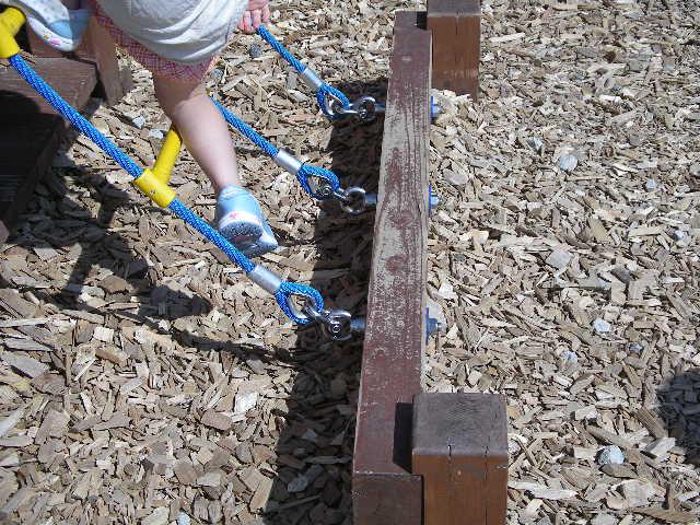 アスレチックの地面はウッドチップが敷き詰められて足下がやさしく、小さなおこさんが転んでもあまり痛くないように出来ています。