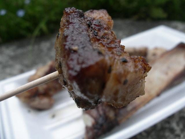 がっつり味わう骨付き月山芳醇豚。大噴水をたのしみながらほおばる観光客がめだちます。