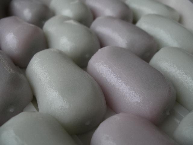 福餅はやわらかく二層になってます。中には甘さ控えめの粒あんがしっとりとあります。黄な粉をまぶしていただきます。