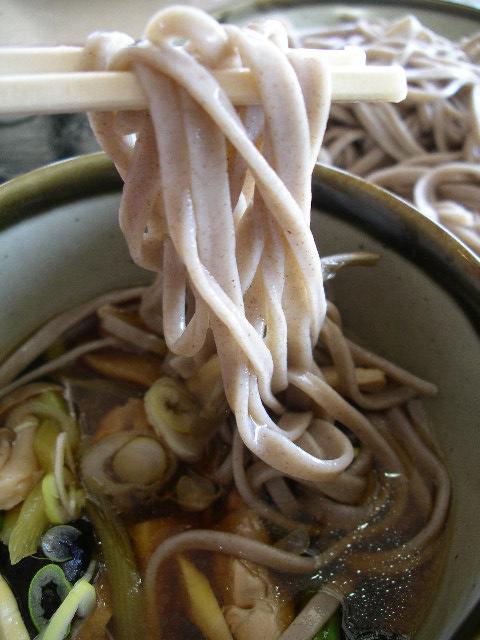 山菜鍋から取り出したあつあつスープに太麺のお蕎麦をつけて食べます。
