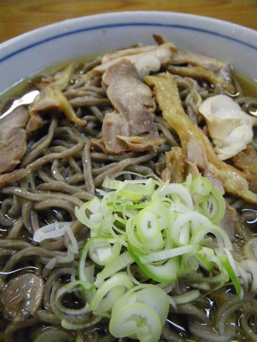 ネギと黒い自家製麺のお蕎麦と親鳥のコントラスト。