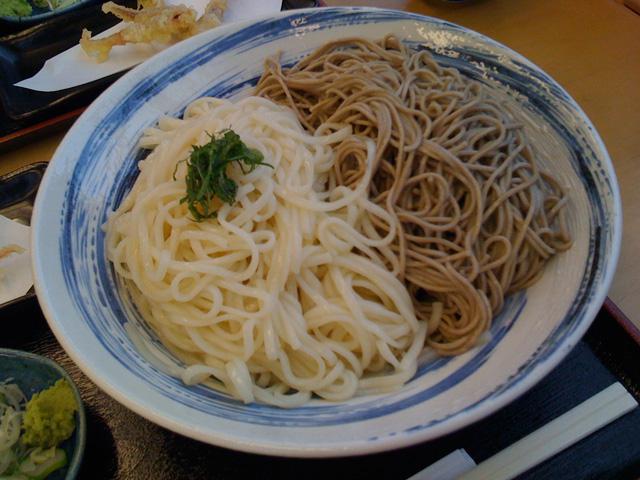 手打ち十割のお蕎麦と麦きりのあいもりです。