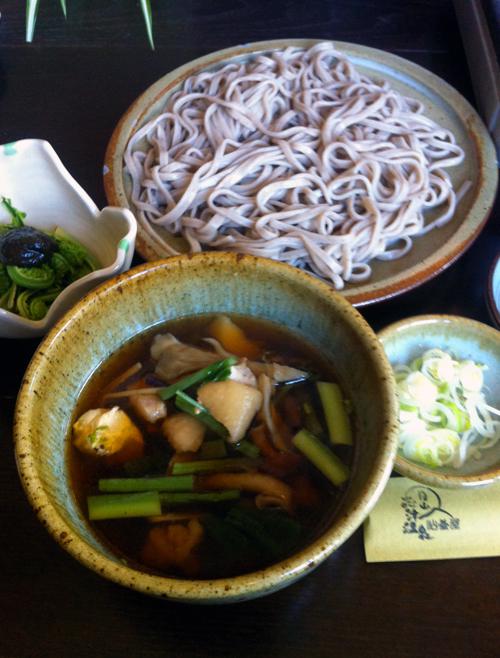 鳥と山菜がいっぱいの鍋と、香り豊かな手打ち蕎麦。
